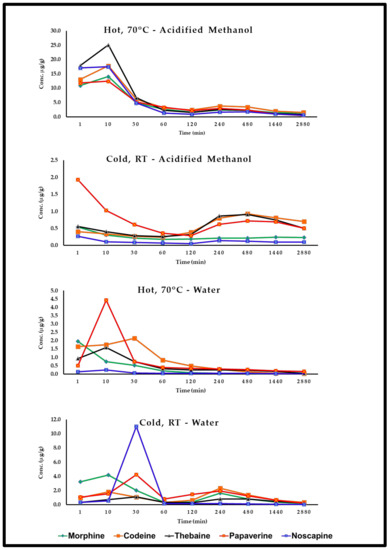 In another experiment, ground poppy seeds (500 mg, #2546) were soaked in 10 mL each of water and methanol (1% formic acid) at different temperatures (cold and hot, 70 °C) and at different time intervals (1, 10, 30, 60, and 120 min; 4, 8, 24, 48 h; 4, 6, and 8 days) with constant agitations. At each time, 10 mL of solution was removed and analyzed for morphine, codeine, thebaine, papaverine, and noscapine. At the same time, 10 mL of water or acidified methanol was added. This process was continued for 8 days, and after 8 days of thorough washing, the samples were dried and ground. Samples were again extracted with water or methanol (1% formic acid) and analyzed separately. In this study, the OAs in each washing cycle were estimated.