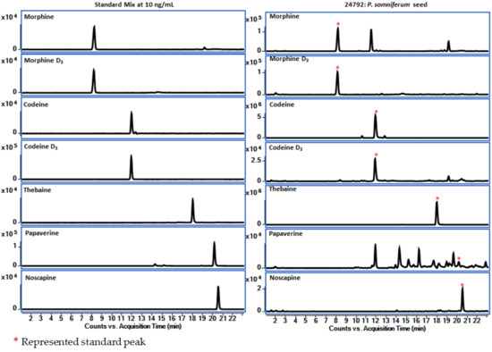 - Sproll, C.; Perz, R.C.; Lachenmeier, D.W. Optimized LC/MS/MS analysis of morphine and codeine in poppy seed and evaluation of their fate during food processing as a basis for risk analysis. J. Agric. Food Chem. 2006, 54, 5292–5298. [Google Scholar] [CrossRef]