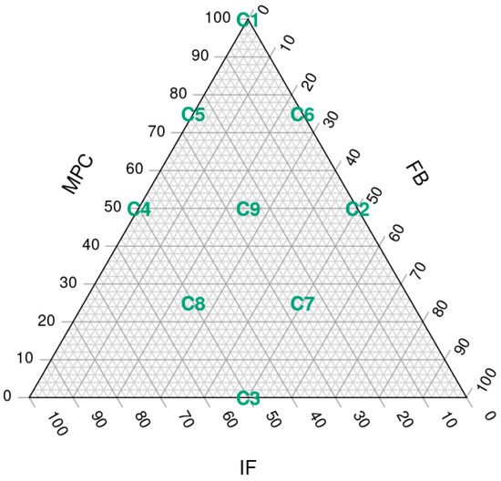 The nine different SCA formulations, labelled from C1 to C9 (Figure 2), contained different percentages of MPC, FBP and IF: C1 (7.1, 0, 0), C2 (3.55, 3.55, 0), C3 (0, 3.55, 3.55), C4 (3.55, 0, 3.55), C5 (5.33, 0, 1.77), C6 (5.33, 1.77, 0), C7 (1.77, 3.55, 1.77), C8 (1.77, 1.77, 3.55) and C9 (3.55, 1.77, 1.77). However, for convenience, throughout the article, we will refer to the MPC/FBP/IF percentage ratio of each SCA: C1 (100/0/0), C2 (50/50/0), C3 (0/50/50), C4 (50/0/50), C5 (75/0/25), C6 (75/25/0), C7 (25/50/25), C8 (25/25/50) and C9 (50/25/25).