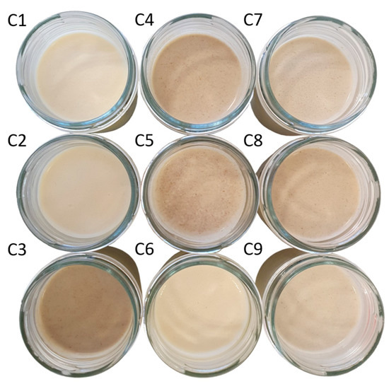 Images of the nine spreadable cheese analogues used in the experiments. The samples, labelled from C1 to C9, contain different ratios of milk protein concentrate, faba bean protein concentrate and insect flour (MPC/FBP/IF): C1 (100/0/0), C2 (50/50/0), C3 (0/50/50), C4 (50/0/50), C5 (75/0/25), C6 (75/25/0), C7 (25/50/25), C8 (25/25/50) and C9 (50/25/25).