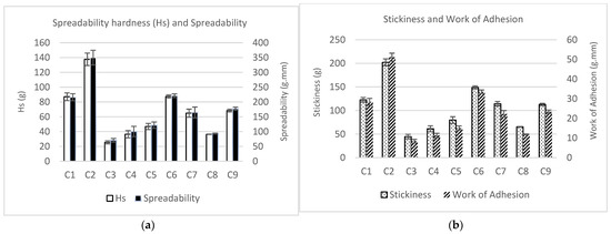All the texture parameters showed similar patterns in all the samples (Figure 3). Moreover, the spreadability (work of shear) was directly proportional to spreadability firmness (Hs), and the stickiness was directly proportional to work of adhesion.