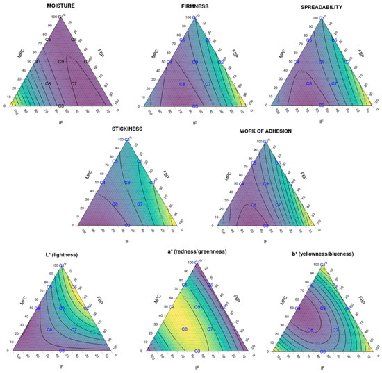Ternary diagrams showing the effect of the three different protein sources and their combinations to the analysed responses: spreadability, stickiness, work of adhesion and L* a* b* colour parameters (R2 > 90% for all responses except for moisture, R2 = 0.744). The samples, labelled from C1 to C9, contain different proportions of milk protein concentrate, faba bean protein concentrate and insect flour (MPC/FBP/IF): C1 (100/0/0), C2 (50/50/0), C3 (0/50/50), C4 (50/0/50), C5 (75/0/25), C6 (75/25/0), C7 (25/50/25), C8 (25/25/50) and C9 (50/25/25).