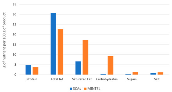 The theoretical nutritional content of the SCAs (protein, crude fat, saturated fat, unsaturated fat, total dietary fibre, carbohydrates, sugar and salt) was calculated using the nutritional content provided by the product data sheets, following Equation (4).