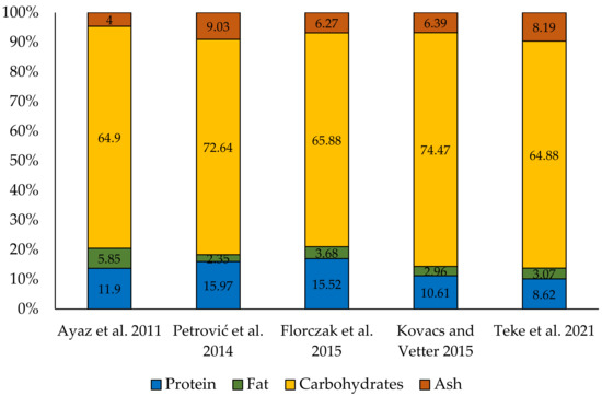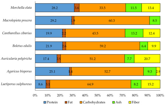 Based on the comparison of the nutritional values of selected edible mushrooms, it was found that L. sulphureus is the species that is the most protein-poor, but the most carbohydrate-rich. The other main components (fat, ash and fiber) are present in amounts similar to those found in other species of mushrooms (Figure 3).