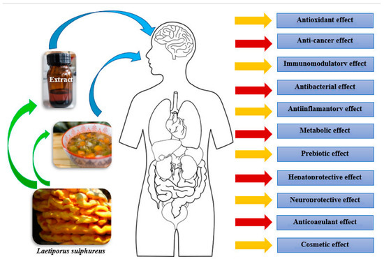Bioactive substances. Substances responsible for the diverse positive effects of Laetiporus sulphureus include tocopherols, steroids, triterpenes, beauvericin, organic acids (including laetiporic and ascorbic acids), lectins, pigments, benzofurans, α-glucans, phenolic compounds, polysaccharides and monosaccharides [1,8,30,33,46,84,85,86]. The composition of bioactive substances found in L. sulphureus is similar to the composition of substances found in Pleurotus ostreatus [1]. Due to its bioactivity, the sulphur shelf fungus has long been used in traditional medicine [87]. Laboratory tests have proven its positive multidirectional effects on the human body (Figure 4).