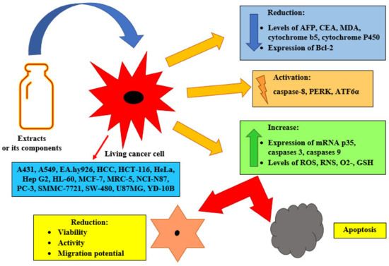 Kim et al. [103] studied the effect of various solvent fractions obtained from methanol extract on the activity of YD-10B cells (human tongue cancer). They found a strong decrease in cell viability under the influence of fractions obtained using hexane and chloroform. Positive results were obtained in the study of ethanol extracts. They caused a strong reduction in the migration potential of HeLa cells and a pro-oxidative effect associated with a significant increase in the level of superoxide anion radicals [104]. Administration of ethanol extract for 45 days at a dose of 250 mg/kg resulted in a decrease in the level of AFP, CEA, MDA, cytochrome b5 and cytochrome P450. In HCC cells (hepatocellular carcinoma), activation of their apoptotic processes was observed, which was associated with a decrease in the expression of Bcl-2 genes and an increase in the expression of mRNA p53, caspases 3 and caspases 9. In general examinations of the condition of the liver tissue, there was a reduction in fat deposition, alleviation of inflammation in hepatocytes and improvement in the condition of the hepatic veins [105]. Similarly, Petrovic et al. [102] found that the ethanol extract inhibited angiogenesis and thus tumor growth of HCT-116 (human colon cancer), but its effect was weaker than that of the lectin isolated from L. sulphureus. The lectin also showed a strong anti-migration effect and strongly inhibited tumor metastasis.