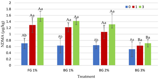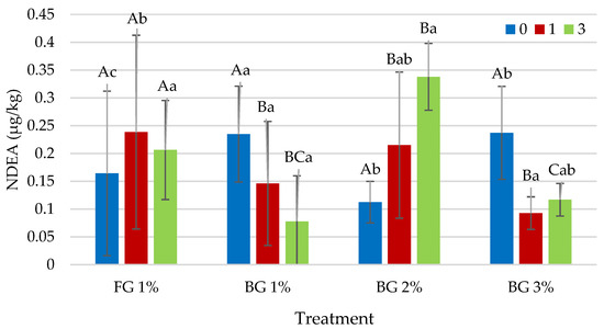 It was determined that both garlic treatment and cooking time had a very significant (p < 0.01) effect on NDEA. In addition, the treatment × cooking time interaction was also effective on the NDEA content of the heat-treated sucuk groups at the p < 0.01 level (Table 3). The use of FG (1%) and BG (1%, 2% and 3%) had no significant effects on NDEA content in heat-treated sucuk when no additional cooking process (0 min) was applied (Figure 2). On the other hand, when cooking time was 1 min, the use of BG in heat-treated sucuk caused a significant decrease in NDEA content compared with FG. However, there were no significant differences between 1%, 2% and 3% levels of BG. In the 3 min cooking process, the group with 3% BG gave the lowest NDEA content (Figure 2). In the present study, the lower NDEA values of the samples containing BG were estimated to be related to both the residual nitrite level and the antioxidant activity of BG. Nitrosamine formation reactions are very complex and are highly influenced by factors such as residual nitrite, water activity, added nitrite level, nitrosation catalysts and inhibitors [15,49]. On the other hand, it was observed that FG and BG have different effects during cooking. In the presence of FG, there was an increase in NDEA content due to the increase in cooking time, while there were no significant effects of cooking time with the presence of 1% BG. While the difference between 0 min and 3 min was found to be significant at 2% BG, a significant difference was also found between 0 min and 1 min of cooking at 3% BG (Figure 2). Considering all these results, it can be said that BG is more effective in preventing NDEA formation during cooking. This result is probably due to the fact that BG contains different antioxidant substances [25,42].