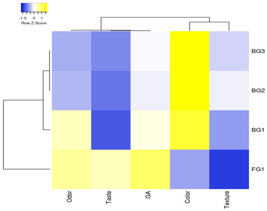 Figure 4 illustrates the two main clusters for sensory analysis, in which the parameters are odor, taste, color, texture, general acceptability (GA) and groups with garlic (FG1, BG1, BG2 and BG3). FG1 participated in the first cluster, while BG1, BG2 and BG3 were taken as part of the second cluster, which included BG1 as a subgroup. FG1 positively correlated with odor, taste and general acceptability, while it negatively correlated with color and texture. BG1, BG2 and BG3 negatively correlated with taste, while they positively correlated with color. On the other hand, BG2 and BG3 negatively correlated with odor.