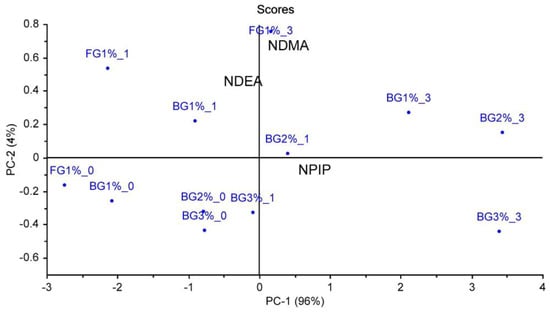 PCA was used to evaluate the relationships between factors (garlic treatment and cooking time) and nitrosamines (Figure 5). The first PC (PC1) was enough to explain 96% of the variation. The PC2 explained 4% of the total variance. One hundred percent of the total variance was explained by the first two principal components. A positive correlation with NPIP and NDMA was determined after 3 min of cooking at both 1% FG and three different BG ratios, and these groups were on the positive part of PC1. The group containing 2% BG and cooked for 1 min (BG2%_1) was on the positive part of PC1 and positively correlated with NDMA and NPIP. In addition, a closer correlation of NPIP with groups containing BG was observed. As can be seen from Table 3, even %1 BG content caused a significant increase in NPIP content. In contrast, NDMA was more correlated with the FG group cooked for 3 min. It was also observed that there was a more positive correlation, especially with NPIP, after 1 min of cooking at the ratio of 2% BG. NDEA, together with uncooked and cooked for 1 min samples except for BG2%_1 min, was on the negative part of PC1, and NDEA was positively correlated with these groups. These results showed that cooking time was correlated more strongly with NDMA and NPIP. The relationship between cooking intensity and NDMA or NPIP was also determined in the previous studies on sucuk and heat-treated sucuk [13,16,17]. However, in the present study, no significant changes were detected in the presence of BG even after 3 min of cooking (Figure 1).