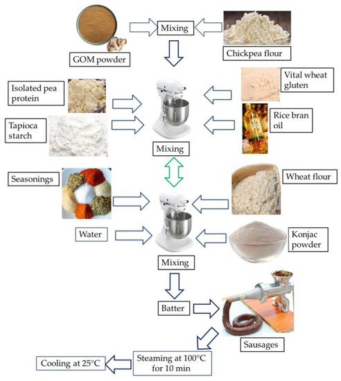 - To find the suitable concentration of GOM powder, and CF for the processing of ES, the following ratios of GOM powder and CF were used: 20:20, 25:15, 30:10 (w/w). Other ingredients, e.g., vital wheat gluten (15% w/w), canola oil (5% w/w), wheat flour (5% w/w), pea protein isolate (5% w/w), seasoning (5% w/w), tapioca starch (10% w/w), konjac powder (5% w/w), and water were added to the mixture (Table 1). To prepare the batter for the sausage, first, different concentrations of GOM powder and CF were mixed properly in a mixer machine (5KPM5EWH, KITCHENAID®, St. Joseph, MI, USA) at a speed of 150 rpm. Thereafter, 50% of other ingredients were added to the mixer machine and mixed properly. The rest of the 50% ingredients were added to the mixer machine and mixed for 10 min. The batter was stuffed into cellulose casings and steamed for 10 min at 100 °C, followed by cooling at 25 °C. For the suitable formula, a concentration of GOM powder and CF was chosen based on the texture profile analysis (TPA), protein content, and consumer acceptability. The developed ES was compared with the commercial plant-based sausage.