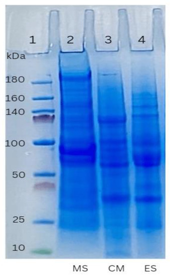 Meat sausage, commercial plant-based sausages, and ES were analyzed for protein patterns using SDS-PAGE. The samples were mixed at a 1:1 ratio with a sample buffer (0.5 M Tris-HCl, pH 6.8, 4% SDS, 20% glycerol, 0.03% bromophenol blue with/without 10% DTT), and boiled for 3 min. The protein-dyed samples were put onto the Roti-PAGE Gradient (4–20%) pre-cast gels and run in a buffer solution-filled electrophoresis tank utilizing a Biostep® GmbH power supply (Burkhardtsdorf, Germany) at a constant current of 60 mA. The gels were stained in a staining solution (Coomassie Blue R-250 methanol-acetic acid) followed by gentle shaking at 50 rpm overnight. The gel was de-stained with de-staining solutions I and II (methanol-acetic acid-water) until the background was clean and then dried.