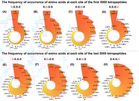 The frequency of occurrence of amino acids at each site of the first 5000 and the last 5000 tetrapeptides. The first 5000 tetrapeptides (A) N-terminal; (B) N-terminal second position; (C) N-terminal third position; (D) C-terminal. The last 5000 tetrapeptides (E) N-terminal; (F) N-terminal second position; (G) N-terminal third position; (H) C-terminal.