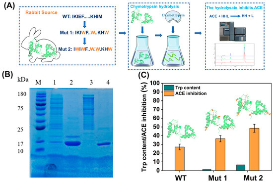 (A) Scheme of hydrolysis products inhibiting ACE activity. (B) Electrophoresis of purified proteins of mutants; 1–2: mut 1; 3–4: mut 2. (C) Effect of substrate Trp content on ACE inhibition rate.