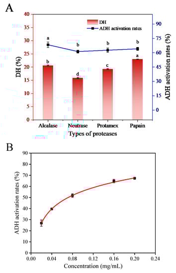 The hydrolysis effects of four proteases and the activation effects of CPHs on ADH are shown in Figure 1A. It can be observed that the sequences of CPHs under different protease hydrolysis conditions were different. Among the four proteases, Alcalase hydrolysis produced CPHs with the highest activation activity on ADH (68.30 ± 2.78%, the actual reaction concentration was 0.2 mg/mL), followed by Papain, Protamex and Neutrase. The ADH activation rate of CPHs obtained by Alcalase was significantly higher than that of CPHs obtained by other three proteases.