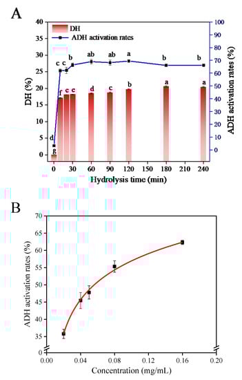 (A) ADH activation rates and DH of Alcalase in hydrolysis time. (B) EC50 values for ADH activation by CPHs-Pro-30. (Different letters (a–g) represent significant differences in values.)