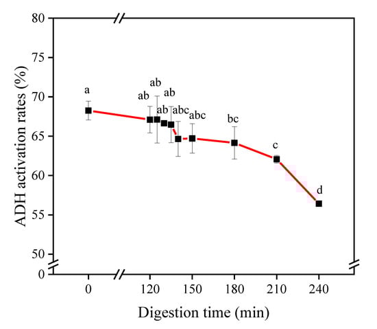Determination of in vitro simulated gastrointestinal digestion followed the method of Brodkorb et al. [12]. A solution of enzymatic hydrolysis was prepared by dissolving 10 g CPHs in 100 mL of 2000 U/mL Pepsin hydrochloric acid solution (pH 3.0) and was cultured in a constant temperature shaking incubator at 37 °C for 2 h (150 rpm) to simulate gastric digestion (SGD). Afterwards, the pH of the digestive system was immediately adjusted to 7.0 with 1 mol/L NaHCO3, and the volume was fixed to 200 mL for simulated intestinal digestion (SID). The solution (100 mL) was inactivated in a water bath at 80 °C for 10 min and rapidly cooled, and this time was recorded as 2 h. Trypsin (100 U/mL) was added to the remaining samples, and samples were taken at different time points under the above digestion time to inactivate the protease and cooled rapidly. The samples were then subjected to subsequent ADH activation assay. The control group consisted of CPHs without simulated digestion in vitro.