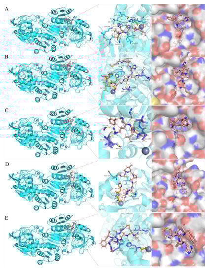 Molecular docking diagram of synthetic peptides (A) ILPHF, (B) MFPHLPSF, (C) LLRF, (D) FDLPALRF and (E) LMLPHF with ADH. (The 3D pink stick models are peptides, the purple stick models are ADH residues, the orange stick models are ADH residues directly linked to the Zn atom and the gray spherical model is Zn atoms. Hydrogen bonds are shown with yellow dotted lines.)