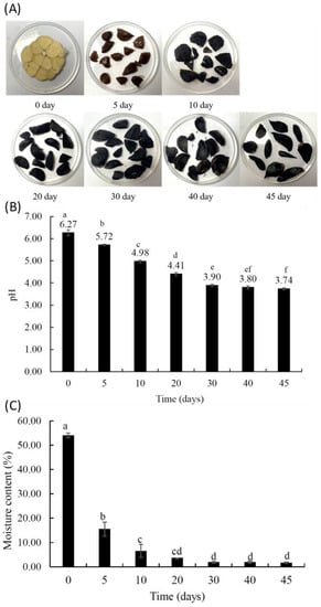 (A) The appearance of fresh garlic and black garlic obtained from different aging durations. (B) pH value of hot-water extract broth of fresh garlic and black garlic obtained from different aging durations. (C) Moisture content of fresh garlic and black garlic obtained from different aging durations. Each value is expressed as mean ± S.D. (n = 3). Different superscript letters indicate a significant difference (p < 0.05).