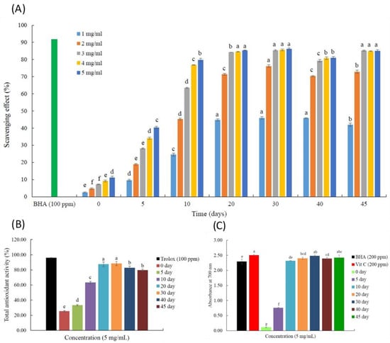 (A) DPPH radical scavenging effect, (B) total antioxidant activity, and (C) reducing power of hot-water extracts obtained from fresh garlic and black garlic with different aging durations. (B) Values are shown as the mean ± S.D. (n = 3). Different superscript letters indicate a significant difference (p < 0.05).