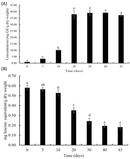 The browning reaction analyses, including reducing sugar, free amino acids, browning indexes, and 5-HMF determination, were conducted on black garlic which had been aged for different durations. The results show that the reducing sugar was 3.24 (mg GE/g dw) in fresh garlic, while the reducing sugar in the extract of black aged garlic increased from 10 to 39 as the aging duration increased from 5 to 30 days, but decreased with further aging (Figure 3A). Our results suggest that there was an increase in the reducing sugar in black garlic throughout the aging duration up until day 40, and there was no significant increase after day 20. Similarly, Choi et al. (2014) demonstrated in their study that the reducing sugar in black garlic increased from 1.2 to 16.07 (g/kg), and no significant difference was observed after 21 days []. In addition, a lower content of reducing sugar was found in black garlic under 90 °C aging compared with <70 °C, but this was accompanied by a poor quality due to intensive burning, resulting in a more intense odor and a tough texture [].