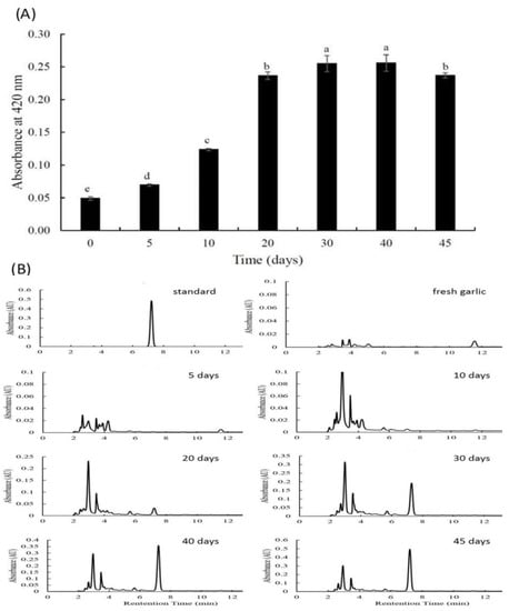 (A) The brown index and (B) HPLC chromatogram of hot-water extracts obtained from fresh garlic and black garlic for 5-HMF for different aging durations. Values are shown as the mean ± S.D. (n = 3). Different superscript letters indicate a significant difference (p < 0.05).