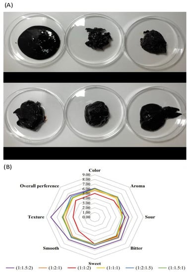(A) The appearance of black garlic jam with different ratios produced by HPP treatment. (B) The sensory evaluation of black garlic jam with different ratios by HPP treatment. Six different ratios of garlic/water/sugar (w/w) were tested: black garlic/water/sugar (w/w) = 1:1.5:2; black garlic/water/sugar (w/w) = 1: 2:1; black garlic/water/sugar (w/w) = 1: 1:2; black garlic/water/sugar (w/w) = 1: 1:1; black garlic/water/sugar (w/w) = 1: 2:1.5; and black garlic/water/sugar (w/w) = 1:1.5:1.