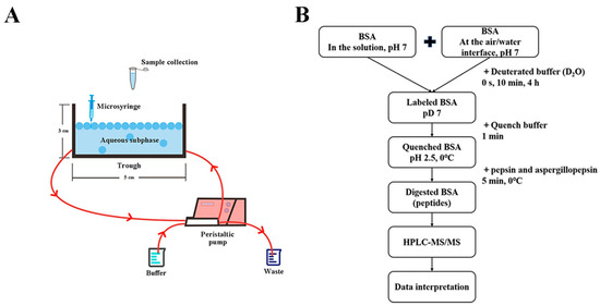 (A) Diagram of the device designed for hydrogen–deuterium exchange (HDX) reactions at the air/water interface (the front view); (B) schematic representation of the workflow for hydrogen–deuterium exchange mass spectrometry (HDX-MS) of bovine serum albumin (BSA) in the solution and at the air/water interface.