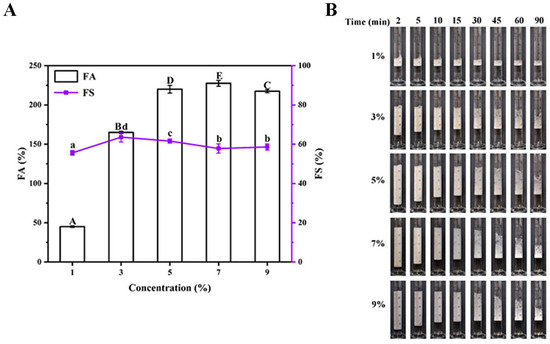 (A) Foam ability (FA) and foam stability (FS) of bovine serum albumin (BSA) at different concentrations (1%, 3%, 5%, 7%, and 9%, m/v); (B) time evolution of the foam volume for different samples. The different uppercase letters represent significant differences (p < 0.05) in FA among samples, and the different lower-case letters indicate significant differences (p < 0.05) in FS among samples.