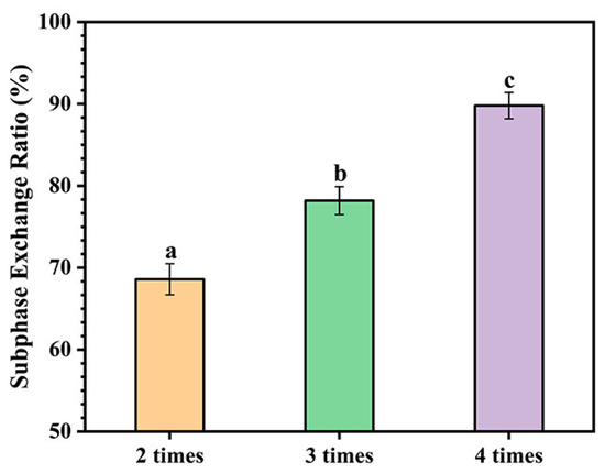 The ratio of subphase exchange with 6 mL (2 times the volume of the subphase buffer in the trough), 9 mL (3 times the volume of the subphase buffer in the trough), and 12 mL (4 times the volume of the subphase buffer in the trough) of fresh buffer. Data denote the mean ± SD of three independent experiments. Significant difference at the p < 0.05 level is expressed by different characters at the top of the columns and points.