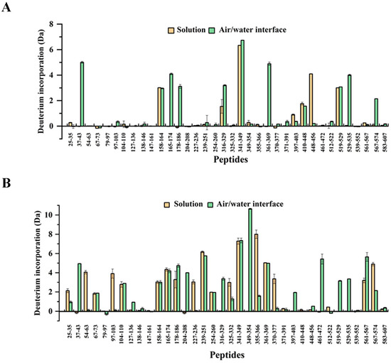 Our results from the HDX-MS analysis show that, in total, 36 digested peptides of the BSA were detected, leading to a 67.1% sequence coverage (Figure 4). In Figure 4A, the results of the 10 min labeling time showed that the degree of deuterium incorporation for most peptides of the BSA was quite low, both in the solution and at the air/water interface. This was because the rates of deuterium incorporation depended on the stability of the protein structures [25]. The flexible proteins fundamentally tended to show fast deuterium incorporation rates, contributing to a larger mass shift in a shorter labeling time. However, for the typical globular protein, BSA, which contains 17 disulfide bonds and is relatively stable, there were extensive regions with a low deuterium incorporation rate. When the labeling time increased to 4 h (Figure 4B), the majority of BSA peptides showed increased deuterium incorporation. The deuterium incorporation of peptides 54–63, 97–103, 165–174, 227–236, 229–251, 355–366, 361–369, 370–377, 561–567, and 567–574 in the solution labeling at 4 h showed a significant increase compared to the labeling at 10 min. The results indicated that these peptides were located on the surface of the BSA and more exposed to the solvent (D2O), which facilitated the adsorption of these peptides to the air/water interface, leading to a certain orientation of BSA at the air/water interface [6]. The peptides 54–63, 165–174, and 355–366 all contained random coil structures, proving the reliability of the HDX-MS results [25]. However, the deuterium incorporation of peptides 448–456 and 519–529 in the solution labeling at 4 h showed a large decrease compared to the labeling at 10 min, as a result of steric solvent shielding (caused by the random protein–protein interaction) and conformational changes [41,42]. As shown in Figure 4, there were significant differences for some peptides in deuterium incorporation between the protein at the air/water interface and in the solution for the interface effect, such as peptides 37–43, 54–63, 97–103, 165–174, 178–186, 204–208, 227–236, 316–329, 349–354, 355–366, 361–369, 370–377, 461–472, 519–529, 529–535, 561–567, and 567–574.