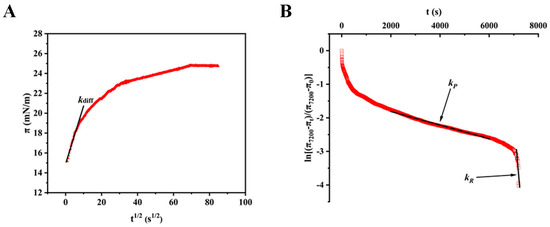 The interfacial rheology of BSA at the air/water interface under the optimal concentration (5%, m/v). (A) Curve of interfacial pressure (π) against the square root of time (t1/2). (B) A typical plot of ln[(π7200 − πt)/(π7200 − π0)] versus time (t).