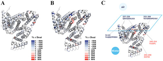 The results of HDX-MS of the BSA in the solution showed that peptide 54–63 exchanged a few deuterium at 10 min labeling, but its deuterium incorporation showed an increase of >4.0 Da at 4 h labeling (Figure 4). However, the same peptide, 54–63, at the air/water interface showed low deuterium incorporation labeling at both 10 min and 4 h, indicating that the air/water interface offered protection from deuterium exchange. Similar results were obtained from the analysis of peptides 227–236 and 355–366. Compared to the BSA in the solution labeling at 4 h, peptide 227–236 at the air/water interface showed a reduction >3.5 Da, and peptide 355–366 demonstrated a decrease >6 Da in the deuterium incorporation (Figure 4B). Figure 6A,B displays the 3D structures of BSA mapped by the relative deuteration percentage labeling at 10 min and 4 h, respectively. From the spatial positions of peptides 54–63, 227–236, and 355–366 in Figure 6C, it was observed that they were on a plane, where the protein interacted with the air/water interface. Thus, we deduced that peptides 54–63, 227–236, and 355–366 were involved in the adsorption of the BSA to the interface, resulting in the certain orientation of the BSA at the air/water interface after 4 h labeling [45]. Our results are in agreement with the current theories: when proteins (especially structured globular proteins) adsorb to the air/water interface, most of the protein molecules remain in the aqueous phase, and only a small part mosaic on the air/water interface [46,47].