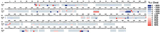 Difference heatmap comparing the deuteration percentages for residues of BSA at the air/water interface versus the deuteration percentages for residues of BSA in the solution. The deuteration percentage in the solution was subtracted from the deuteration percentage at the air/water interface, and the values were colored (positive values in red and negative values in blue, as indicated; % r Deut, relative deuteration percentage).