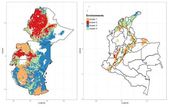 The third step was the estimation of the market size through assigning a proportion of the potential area identified in Section 4.2.1 to each of the two hybrids of interest (interspecific Urochloa and Megathyrsus maximus hybrids). This proportion was obtained from a TPE study conducted by CIAT in 2019 (V. Castiblanco; A. Notenbaert, personal communication, 13 June 2019) [37]. This study applied both GIS and multivariate cluster analysis, and in this way, areas with similar environmental traits in Africa and Colombia could be identified [37] (see Figure 2). This allowed the pilot experiment referenced in Section 3 to be carried out in Colombia. Likewise, four geographic clusters with similar environmental characteristics were identified [37], considering cattle density [80], soil quality data [81], and different precipitation levels [82,83].