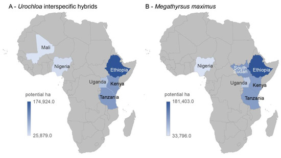 Figure 3B shows the results for the potential market (market size) of Megathyrsus maximus hybrids. South Sudan holds the biggest market potential with 129,271 ha, followed by Ethiopia (115,840 ha), Tanzania (109,100 ha), Kenya (78,372 ha), and Uganda (61,888 ha). In West Africa, Nigeria offers a potential market for Megathyrsus maximus hybrids of 33,938 ha. These figures imply that the mere participation of South Sudan, Ethiopia, and Tanzania represents about 67% of the potential area of adoption of Megathyrsus maximus hybrids in the analyzed countries, and 72% when only the East African countries are considered. These results show the most representative markets in the analyzed countries, according to areas best suited to adopt one of the two technologies of analysis.