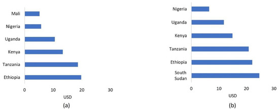 Dairy production is the most representative cattle activity in the region of analysis. According to the FAO, the dairy cattle herd in Africa for 2020 reached 66,330,001 heads. The largest inventory is concentrated in East Africa, which holds 34,723,481 dairy cattle. Within this region, the largest herds are found in South Sudan (8,432,559 dairy cattle), followed by Ethiopia (7,556,402), Tanzania (7,116,771), Kenya (5,112,340), and Uganda (4,037,038) [78]. To understand the relative importance of the dairy sector, some figures regarding beef cattle are important to consider, since its participation in the region is lower. Africa counts with a total beef cattle herd of 41,720,252 heads, and in East Africa, there are about 14,527,659 beef cattle. The countries with the highest inventory of beef cattle in the region are Ethiopia (4,086,481 beef cattle), Tanzania (3,554,364), Kenya (1,953,734), Uganda (1,217,247), Zambia (1,065,054), and South Sudan (964,884) [78]. Given the importance of the dairy sector in the region, only the information on dairy cattle was considered to estimate potential hectares of improved forages needed to feed the animals according to the methodology exposed in the previous section. A summary of the RAFT and HaP estimates for the analyzed countries can be found in Table 4.
