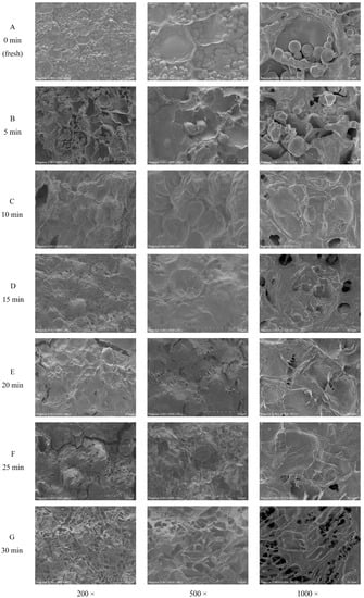 Morphologic observation of sweet potatoes during steaming. Scanning electron microscope images of sweet potato samples steamed for 0, 5, 10, 15, 20, 25, and 30 min are labeled with (A–G), respectively.