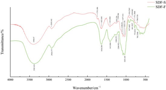 The FT-IR spectra of the SDF-F and SDF-S are presented in Figure 4. The strong bands at around 3385 cm−1 were assigned to the O-H stretching vibration, indicating the existence of hydrogen bonds within or between polysaccharides. Weak bands around 2930 cm−1 were due to the asymmetric stretching vibration of C-H, which were typical absorption peaks of polysaccharide [44,45]. Notably, the SDF-S showed a unique peak at 1741 cm−1, which indicated the C=O stretching of ester bonds [30] and revealed the existence of pectin [46]. There were two bands that indicated the free carboxylate groups in sweet potato SDF: an asymmetrical stretching band around 1630 cm−1 and a weaker symmetric stretching band around 1413 cm−1 [47]. The peaks near 1367 cm−1 indicated the presence of sulfate groups in these two SDF [48,49]. The peaks at 1104, 1077, and 1035 cm−1 indicated the existence of stretching vibrations of C-C and C-O, which were attributed to glycosidic linkage between sugar units [50]. The peaks at 840 cm−1 and 910 cm−1 indicated there were α-glycoside bonds and β-glycoside bonds in both sweet potato SDFs, respectively [51,52], which might refer to the α-1,2, α-1,6, β-1,2, and β-1,6 bonds in their resistant dextrin components [53]. From the FT-IR spectra, the type and position of the main absorption peaks of SDF-F and SDF-S did not change substantially upon steaming, but the different intensity of absorption peaks indicated that the physicochemical and functional properties of sweet potato SDF may have changed.