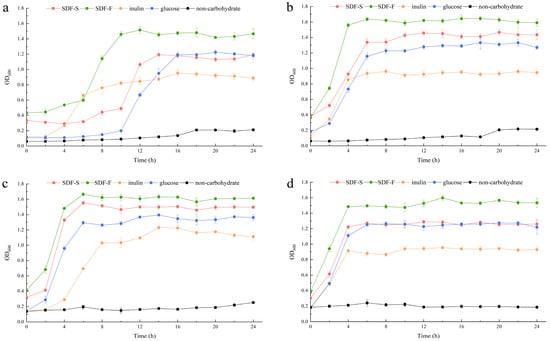 The proliferation of the Lactobacillus spp. was measured with OD600 of the culture, and acidogenicity was assessed with the culture pH in the present study, both of which are important indices of the benefits of Lactobacillus spp. [54,55]. They are determined mainly on the hereditary property of Lactobacillus spp., but also associated with the quantity and quality of probiotic in the culture [56]. The changes of OD600 and pH values during the 24 h of culturing demonstrated that both SDF-S and SDF-F promoted the proliferation and acid production of Lactobacillus spp., and their effects were superior to inulin, the commercial prebiotic. The carbon source utilization during the 24 h culturing is reported in Table 3. It was shown that glucose was the favorite carbon source for the four Lactobacillus spp., followed by the SDF-F, SDF-S, and inulin in turn, with significant differences among the four carbohydrate groups (p < 0.05). Although more glucose was utilized, the SDF-F presented the superior effect on the proliferation and acidogenicity of the four Lactobacillus spp. (p < 0.05). These results were in accordance with the rather shorter lag growth phase in the SDF-F group than the others (Figure 5a–c). The different lag growth phase among the four Lactobacillus spp. cultured with same carbon source might result from their different hereditary and physiological properties (Figure 5).