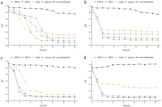 Changes in pH of the Lactobacillus spp. cultures with different carbon sources. (a) L. plantarum; (b) L. reuteri; (c) L. acidophilus; (d) L. rhamnosus.