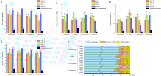 After 24 h of fermentation, SCFA in these Lactobacillus spp. cultures were analyzed. Additionally, the results are reported in Figure 7. Acetic acid, propionic acid, and butyric acid were the main SCFA produced by Lactobacillus spp. fermentation with these four carbon sources, of which acetic acid accounted for the highest proportion (Figure 7e).