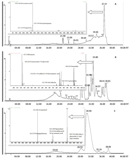 2.5. Study of Phenolic Biotransformations in Fermented Wheatgrass Juice by Untargeted LC-MS MALDI-TOF/TOF Technique
