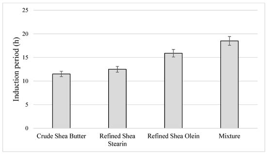 Induction period (h) of crude shea butter, refined shea stearin, refined shea olein and a mixture of olein:stearin 1:1 w/w.