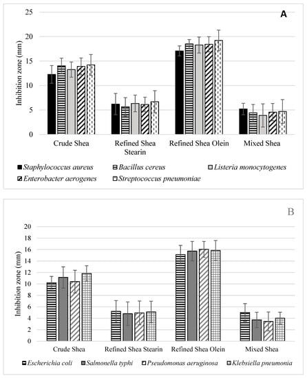 Antibacterial activity of crude shea butter, refined shea stearin, refined shea olein and a mixture (olein:stearin 1:1 w/w) determined against Gram-positive (A) and Gram-negative (B) pathogens.