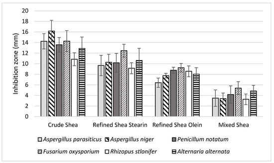 The antifungal efficacy of crude shea butter, refined fractions (stearin and olein) and their mixture (stearin:olein (1:1 w/w)) was investigated, and the results are shown in Figure 3. The findings show that crude shea butter significantly impacted four different types of toxic fungi. Refined shea stearin came in second place in antifungal action. There was still an antifungal effect from the shea olein fraction, which was quite similar to the effect from the shea stearin fraction. The mixture of shea olein and stearin fractions showed the lowest antifungal activity. Several bioactive components in crude shea butter may explain its high antifungal activity. In addition to phenolic compounds, it is abundant in unsaturated triglycerides, phytosterols and tocopherol. A role in the antifungal activity of black cumin and Roselle oil was found by Badr et al. [], and this role might be related to the concentration of minor components such as γ-tocopherol. Losses in minor and bioactive components may account for the decline in antifungal properties of refined shea relative to the combination of shea fractions (stearin and olein).