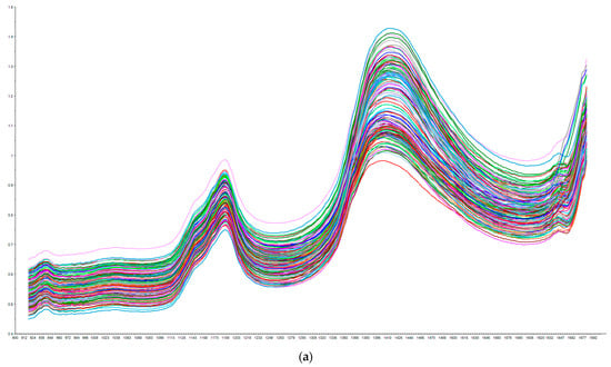 Figure 1 illustrates the raw near-infrared spectra for all pork belly fat samples (Figure 1a) and all loin chop lean samples (Figure 1b). Regarding the loin chop lean spectra in Figure 1b, we observe two absorbance bands, which occurred at similar wavelength ranges in a study by Prieto et al. [17] that reported example raw visible NIR spectra of intact meat samples of several species, including pork, using a portable NIR instrument. We see a large absorbance band around 1400 nm in Figure 1a,b, which may be due to the absorbance of water, which is reasonable due to the high water content of fat and lean tissue (65% moisture in chop lean samples; Table 1). In addition, the absorbance band observed around 1700 nm in Figure 1a,b corresponds to the NIR absorption bands around 1600–1800 nm that are due to straight carbon chain fatty acids [18]. NIR absorbance bands of fatty acids beyond 1692 nm may exist, but they are not visible in the plotted range seen in Figure 1a.