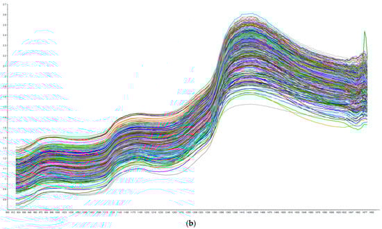 (a) Raw near-infrared spectra collected on all pork belly fat samples (N = 158) using the Tellspec NIR device. X axis = Absorbance; Y axis = Wavelength (nm). (b) Raw near-infrared spectra collected on all loin chop lean samples (N = 419) using the Tellspec NIR device. X axis = Absorbance; Y axis = Wavelength (nm).