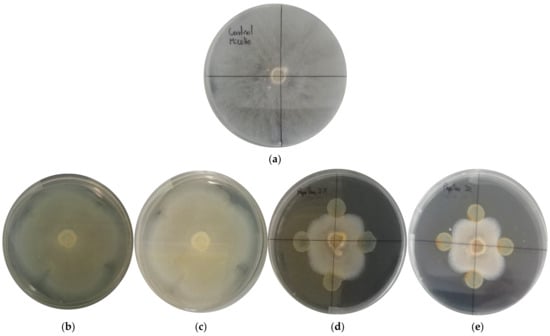 To determine the MIC, different concentrations of EEP (1% (b), 1.5% (c), 2% (d) and 3% (e) w/v) were analyzed in vitro in direct contact with the fungal mycelium on PDA plates and a control sample without EEP (a) (Figure 1). The tests were incubated for 5 days at 20 °C. After this period, it was possible to observe radial growth inside the Petri dishes at concentrations of 1 and 1.5% w/v of EEP (Figure 1b,c). One of the advantages of this technique, for which it has been described as the “gold standard” compared to other methods that assess susceptibility to antimicrobials, is that, in addition to confirming unusual resistances, it gives definitive answers when the result obtained by other methods is indeterminate []. In this case, the MIC was defined as the lowest concentration of an antimicrobial agent that visibly inhibited the growth of a microorganism after an incubation period in contact with it []. The first concentration that stopped the radial growth of the filamentous molds studied was 2% w/v (Figure 1d). In general, this fungal behavior depends on the species under study, since there are fungal organisms that have physiological and biochemical versatility in the presence of a stressor, which in this case was EEP. A physiological defense mechanism to counter stress factors is the increase in growth rate or increased biochemical activity translated into the production of lytic enzymes and reactive oxygen species. The antimicrobial effect of propolis depends on several factors, such as the type of microorganism (e.g., bacteria, yeast, virus, mold), cell concentration (with a high inoculum, larger amounts of propolis were required for antimicrobial action), and the mode of action (a growth retardation rather than complete inhibition) []. Propolis, in the form of EEP, has been used successfully in in vitro inhibition studies of several phytopathogenic fungi, such as Alternaria alternata and Fusarium oxysporum f. sp. melonis, among others, that cause food spoilage [].