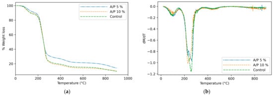 Weight loss stages can be better observed in the curves of the derivative of the TGA (Figure 2b), which coincides with the findings of Bagheri et al. (2019) [] who observed that the progressive weight loss at 201 °C in alginate films is mainly due to glycerol evaporation. They further point out that the maximum weight loss near temperatures of 207, 209 and 212 °C, with termination temperatures at around 230 °C, were observed for the films dried at 90, 57 and 25 °C, respectively.