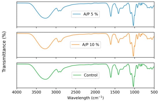 All films exhibited a pronounced first absorption band in the range of 3600–3000 cm−1, which indicated the presence of OH functional groups [,]. The absorbed water molecules are due to the presence of glycerol as a plasticizer, which is characterized by being hygroscopic []. The lack of absorption bands in the spectrum between 2600 and 1800 cm−1 indicated that there is no presence of functional groups with triple bonds, as mentioned by Asma et al. (2014) [].